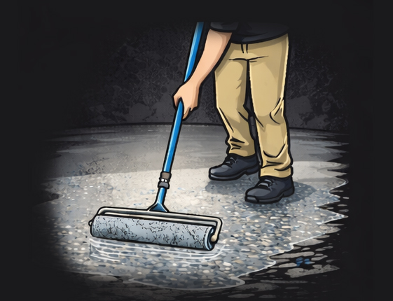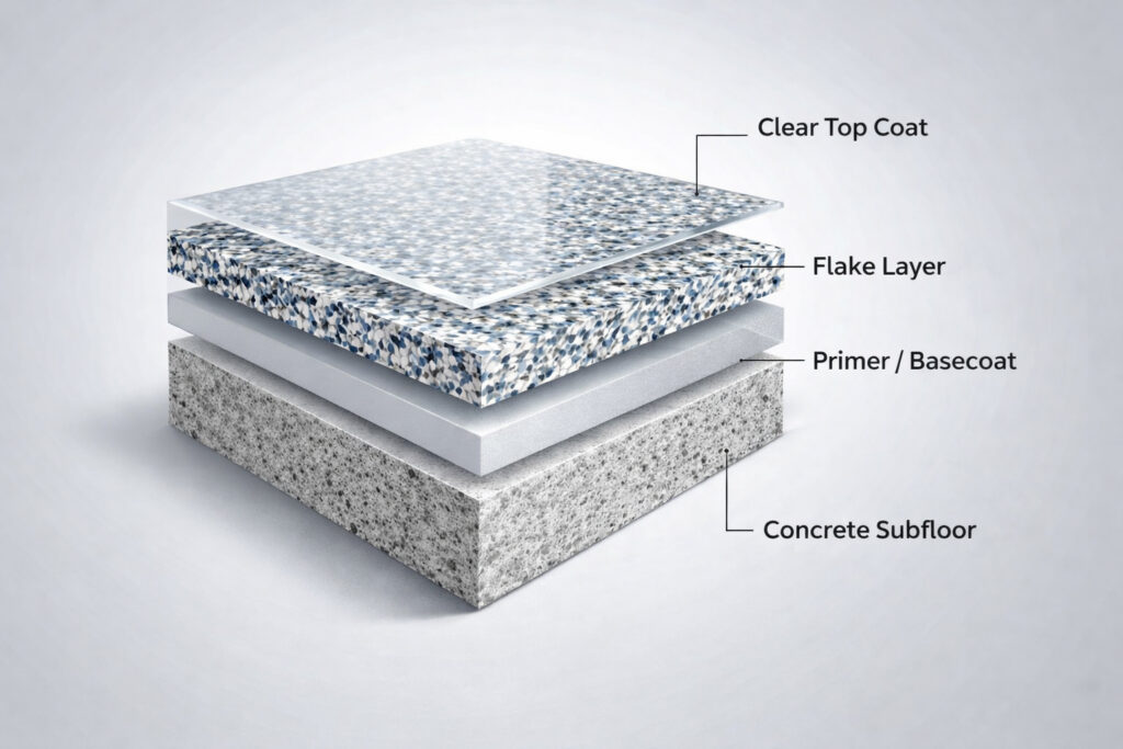A durable epoxy or polyurea basecoat is applied as the adhesive foundation for the flake flooring system.