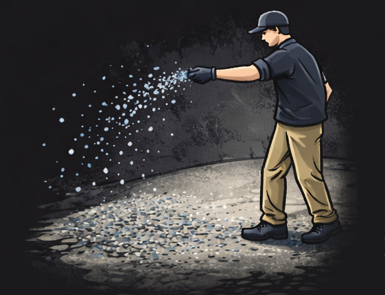 Decorative polymer flakes are evenly broadcast over the tacky basecoat to create texture, color, and slip resistance.